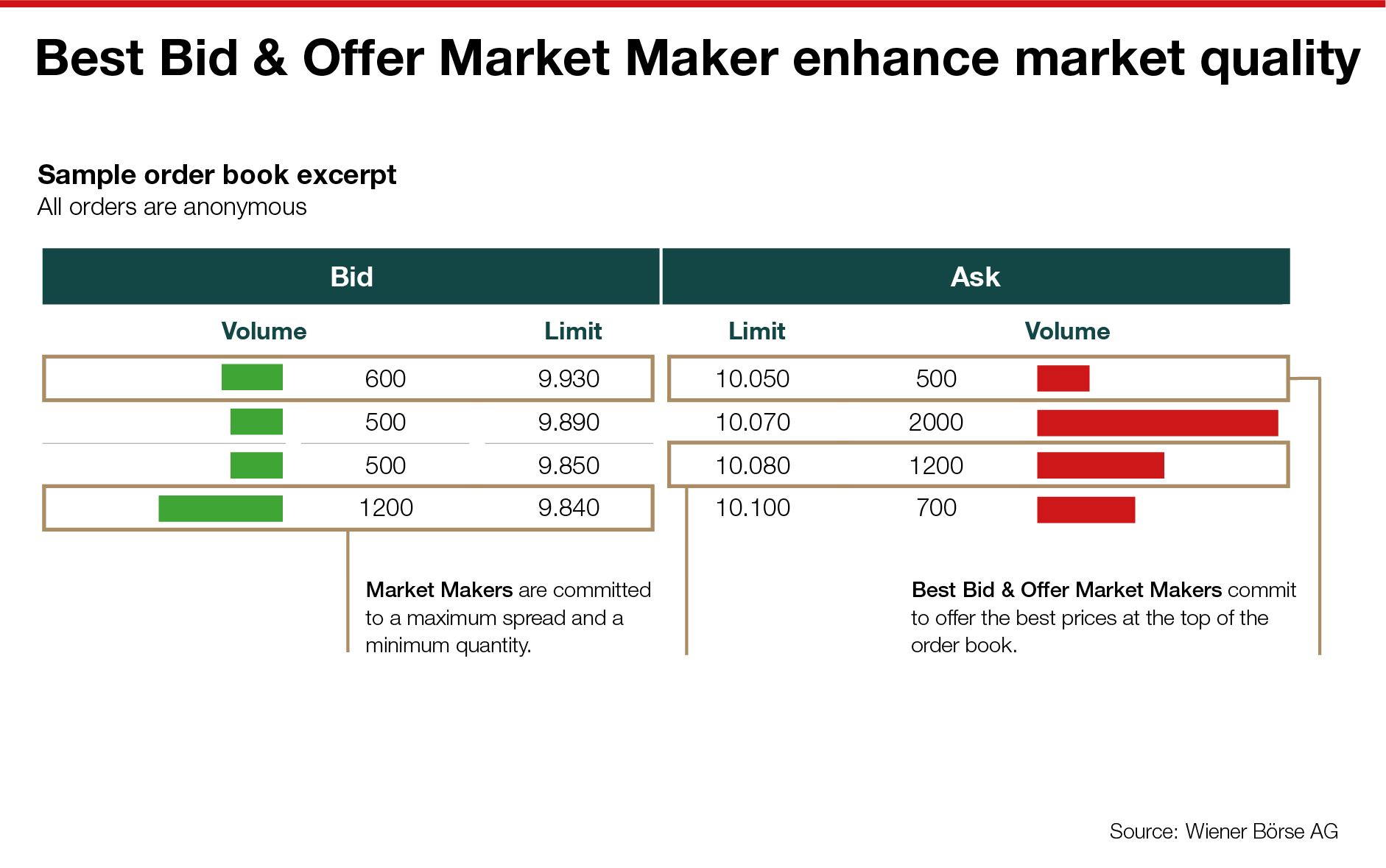(Vienna) As of today, a new market making model will come into effect on the Vienna Stock Exchange. In addition to the existing Market Maker, the "Best Bid and Offer" Market Maker (BBO Market Maker) will be introduced in the top segment prime market. The previous Specialist-role will be replaced. Market makers are trading participants who provide additional liquidity in the order book with binding buy and sell bids and ensure execution at market prices. The new BBO Market Maker commits to offering bids at the best available prices – at the top of the order book. Already three well-known market makers (HRTEU Limited, Tower Research Capital Europe BV and XTX Markets SAS) have decided to participate. The aim is to further narrow the spreads and thus to increase the attractiveness of Austrian shares on the Vienna trading venue. Both retail and institutional investors benefit from an increase in price quality. Professional trading participants are free to choose the established or the new market making model.