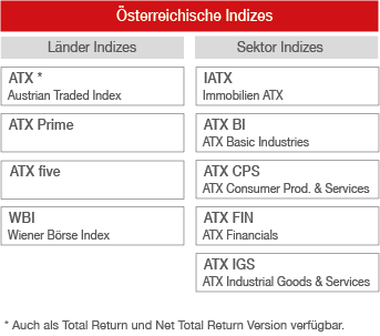 Die ATX Indexfamilie beinhaltet ausschließlich Indizes mit österreichischen Aktien. Neben dem ATX, dem Leitindex der Wienerbörse, der die liquidesten und am höchsten kapitalisierten Aktien des österreichischen Kapitalmarktes darstellt, bildet der ATX Prime, als klassischer Segmentindex, die im prime market notierten Werte ab. Mit dem ATX five sollen die 5 stärksten Aktien, und damit die für den Umsatz hauptverantwortlichen Unternehmen abgebildet werden. Die Zusammensetzung des IATX konzentriert sich auf die im prime market notierten Immobilienwerte. Der WBI als ältester Index der Wiener Börse ist ein all-share Index, der bereits seit 1967 berechnet wird.