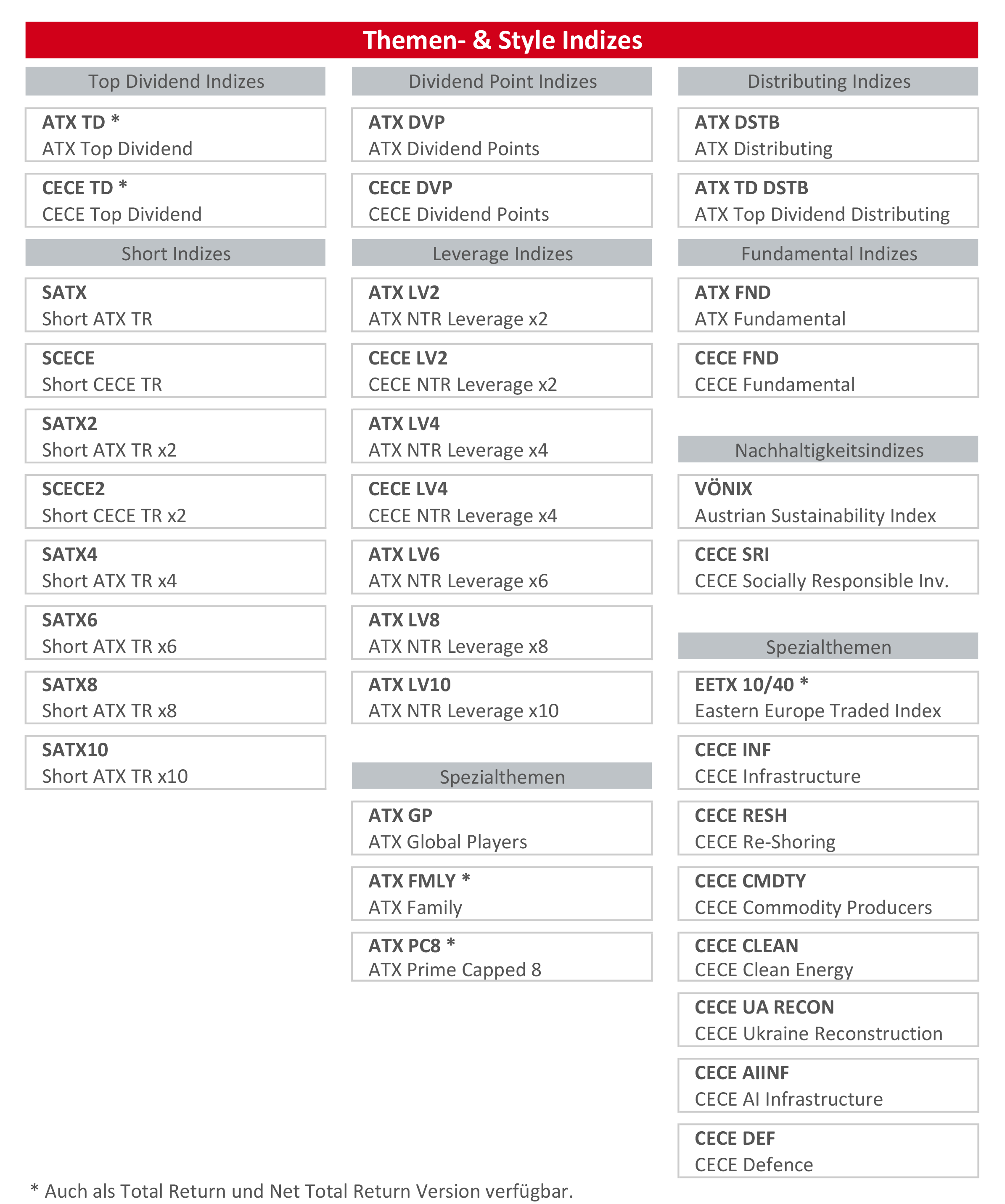 Mit den Themen & Style Indizes reagiert die Wiener Börse AG auf die gestiegenen Anforderungen der internationalen Märkte an einen Index. VÖNIX und CECE SRI fokussieren auf das Thema Nachhaltigkeit und fassen gemäß strengen Kriterien die besten Unternehmen dieser Klasse in einem Index zusammen. Die Short Indizes ermöglichen es Investoren auf fallende Kurse zu setzen. Bei den berechneten Fundamentalindizes wird die Gewichtung der Indexmitglieder auf Basis fundamentaler Kennzahlen vorgenommen. Die Top Dividend Indizes umfassen jene Unternehmen mit der höchsten Dividendenrendite.