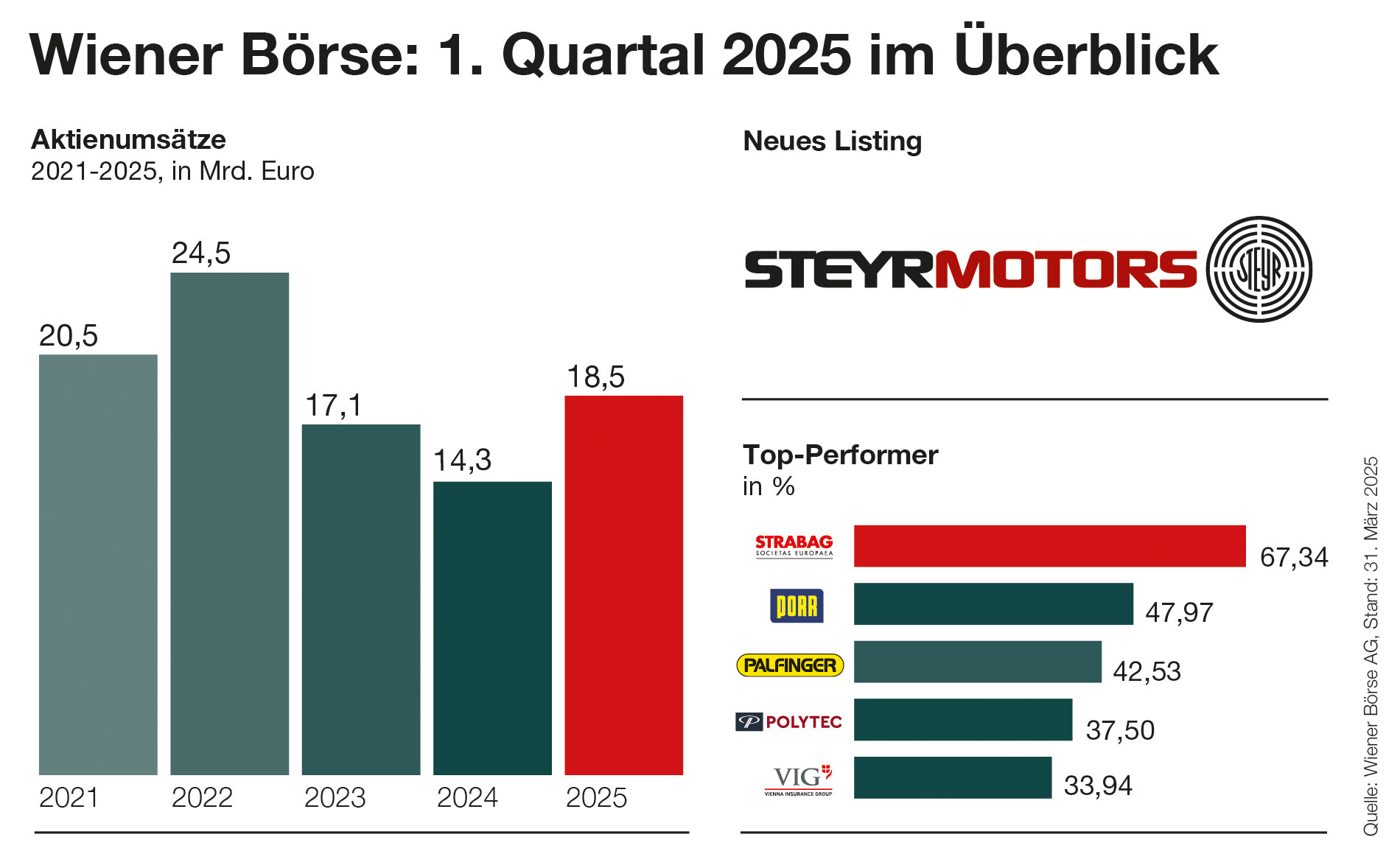 Die Umsätze aus Beteiligungswerten beliefen sich im ersten Quartal 2025 auf 18,5 Mrd. EUR. Das entspricht einem Plus von rund 30 % gegenüber dem ersten Quartal 2024 (14,3 Mrd. EUR). Die drei stärksten Handelstage im ersten Jahresviertel waren der 21. März (1,08 Mrd. EUR), 28. Februar (897,0 Mio. EUR) und 5. März (510,3 Mio. EUR). Die meistgehandelten österreichischen Aktien waren zum März-Ultimo Erste Group Bank AG (4,4 Mrd. EUR), OMV AG (3,0 Mrd. EUR) und BAWAG Group AG (1,7 Mrd. EUR). Zuletzt wurde das internationale Segment global market um 38 Aktien aus vier Ländern erweitert – diese können zu Inlandsgebühren, in Euro und zu den Handelszeiten der Wiener Börse gehandelt werden.