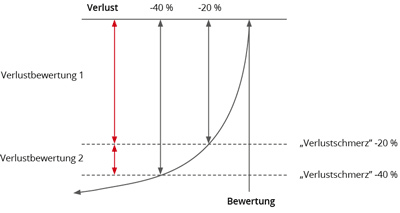 Auch bei Verlusten ist unser emotionales Handlungsmuster rational. Analog zur Gewinnwahrnehmung verläuft auch die Verlustwahrnehmung nicht linear. Verlustzuwächse schmerzen emotional weniger. Der Schmerz bei einem Verlust von 20 Prozent ist deutlich messbar. Erhöht sich dieser auf 40 Prozent, steigt der Schmerz nur noch marginal an. Ein Verlust ist für uns emotional nur dann als solcher wahrnehmbar, wenn wir diesen realisieren. Solange investiert ist, bleibt die Hoffnung auf eine Trendwende und damit die Idee, Buchverluste wieder aufzuholen. Daher macht es emotional gesehen keinen Sinn, bei Buchverlusten zu verkaufen.