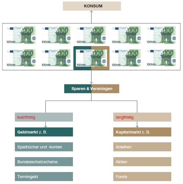 Geld, das nicht für den Konsum verwendet wird – in Österreich sind dies im langjährigen Durchschnitt etwa zehn Prozent des verfügbaren Volkseinkommens – wird gespart. Die Möglichkeiten zur Veranlagung sind vielfältig: z.B. Wertpapiere, Sparprodukte.